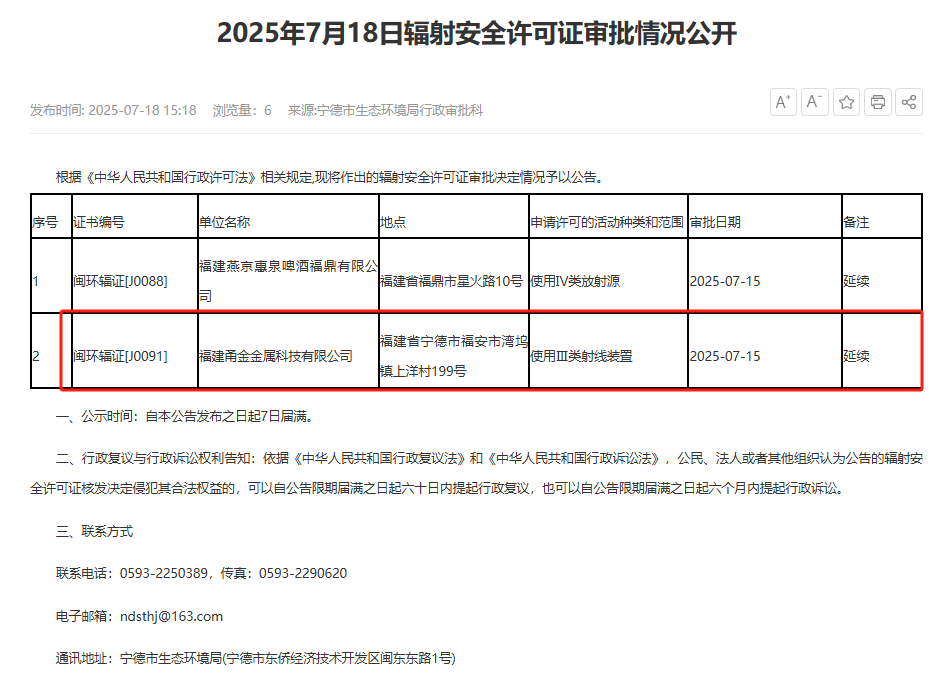 據顯示,福建甬金金屬科技有限公司使用Ⅲ類射線裝置輻射安全許可證于2025年7月15日獲審批通過。