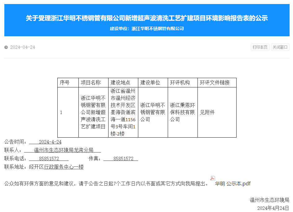 4月24日,溫州市生態(tài)環(huán)境局受理浙江華明不銹鋼管有限公司新增超聲波清洗工藝擴建項目環(huán)境影響報告表并對外進行公示,公示期:7個工作日。