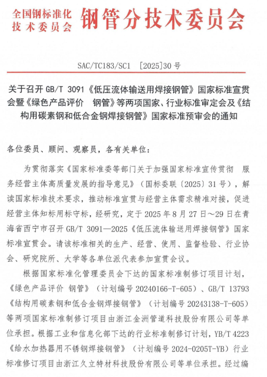 經(jīng)研究,定于2025年8月27-29日在青海省西寧市召開《綠色產(chǎn)品評價鋼管》和YB/T4223《給水加熱器用不銹鋼焊接鋼管》等兩項國家、行業(yè)標(biāo)準(zhǔn)審定會及GB/T13793《結(jié)構(gòu)用碳素鋼和低合金鋼焊接鋼管》國家標(biāo)準(zhǔn)預(yù)審會。