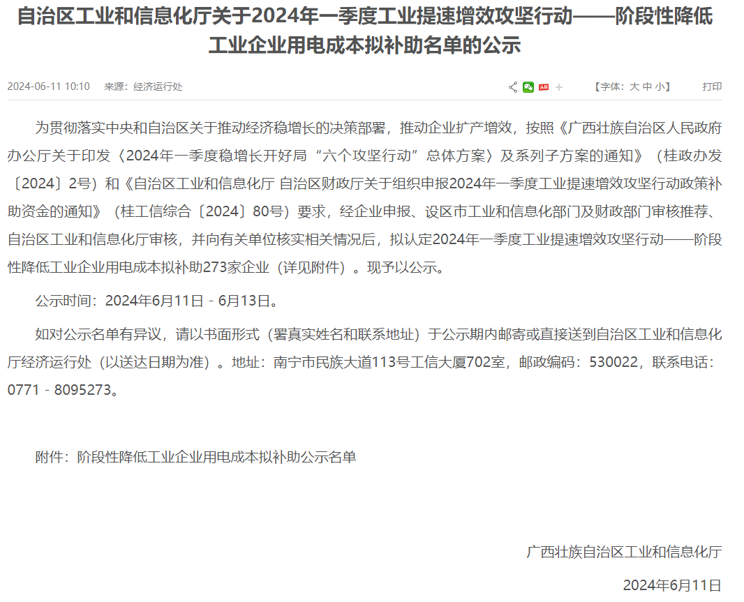 2024年6月11日,廣西壯族自治區工業和信息化廳就一季度階段性降低工業企業用電成本擬補助名單對外進行公示,公示時間:2024年6月11日-6月13日。