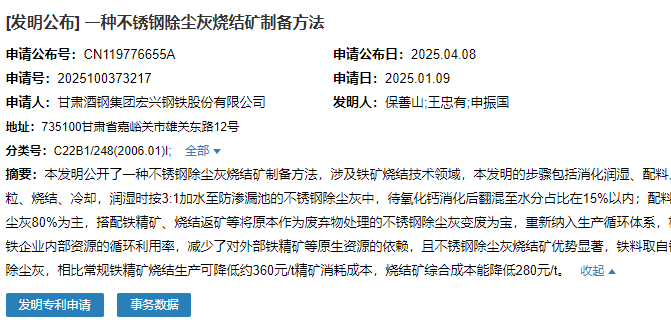 2025年4月8日,甘肅酒鋼集團(tuán)宏興鋼鐵股份有限公司成功申請(qǐng)一項(xiàng)名為“一種不銹鋼除塵灰燒結(jié)礦制備方法”專利,申請(qǐng)公布號(hào)為CN119776655A,申請(qǐng)日期為2025年1月9日。