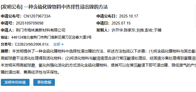 2025年10月17日,荊門市格林美新材料有限公司成功申請(qǐng)一項(xiàng)名為“一種含硫化鎳物料中選擇性浸出鎳的方法”專利,申請(qǐng)公布號(hào)為CN120796733A,申請(qǐng)日期為2025年7月15日。